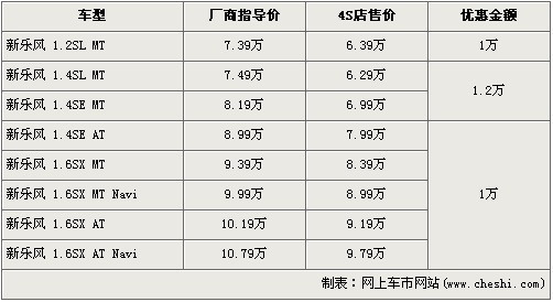 新樂(lè)風(fēng)是雪佛蘭旗下的三廂入門級(jí)家用車銷售主力,但由于上市多年,消費(fèi)者對(duì)于它也產(chǎn)生了審美疲勞。在今年的5月份,帶有家族新特征的小改款新樂(lè)風(fēng)來(lái)到世人眼前,外觀的改進(jìn)讓此車動(dòng)感不少。近日據(jù)網(wǎng)上車市價(jià)格系統(tǒng)檢測(cè)顯示,新樂(lè)風(fēng)出現(xiàn)了最高1.2萬(wàn)元的優(yōu)惠,具體價(jià)格詳情請(qǐng)看下表: