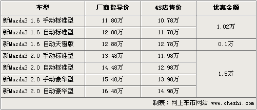 馬自達3自4月份1.6L的自動天窗版車型上市以來,一直受到消費者關(guān)注。運動與操控完美結(jié)合讓馬自達3擁有較好的口碑。根據(jù)網(wǎng)上車市價格監(jiān)測系統(tǒng)顯示,馬自達3現(xiàn)最高優(yōu)惠1.5萬元,1.6L有少量現(xiàn)車供應(yīng)。具體行情如下: