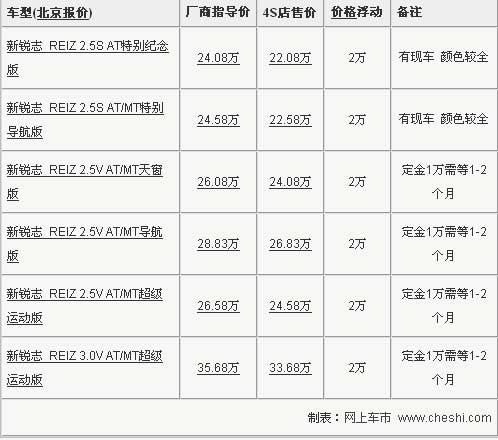 據(jù)北京一汽豐田4S店銷售人員介紹,目前銳志全系優(yōu)惠2萬元,銳志 REIZ 2.5S AT特別紀(jì)念和2.5S AT/MT特別導(dǎo)航版有現(xiàn)車供應(yīng),且顏色較全,其余高配車型均需要預(yù)定。銷售人員還表示:現(xiàn)車的顏色有銀、白、黑、紅可供選擇,有現(xiàn)車的這兩款車型是豐田銳志賣的最火的也是性價(jià)比最高的兩款車型。消費(fèi)者交定金1萬等待1-2個(gè)月便可提車。北京地區(qū)各4S店由于訂單不同,各店銷售的現(xiàn)車顏色有所不同。