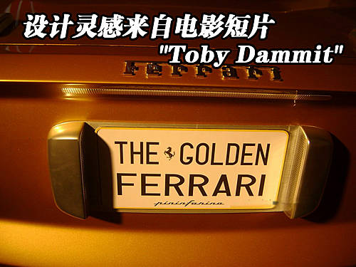 這輛黃金法拉利,除了"Golden Ferrari"這個(gè)直白的綽號外,其他部分完全未知。從外表判斷,黃金法拉利基于599 GTB,但實(shí)際上Pininfarina的設(shè)計(jì)靈感來自于某電影短片"Toby Dammit"中出現(xiàn)的法拉利330 LMB。