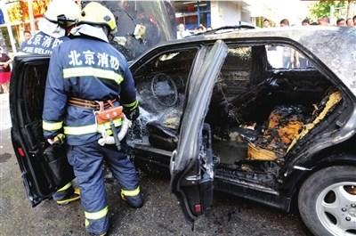 昨天下午4點10分,出事車輛斜停在輔路上,消防員正在車體起火處噴水。約15分鐘后,滅火完畢,車前蓋內的配件已是一片漆黑,消防員打開車門查看時,發(fā)現(xiàn)車內坐墊等物已被燒焦。