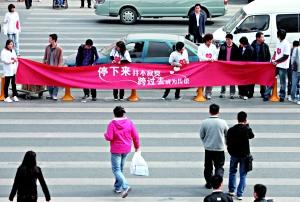 “停下來并不寂寞,跨過去成為傳說!弊蛉(27日)上午,中關(guān)村海龍大廈前面的丁字路口,十余名年輕人手持橫幅,在人行道上站成三排,組成“人肉斑馬線”,陪行人一起等紅燈;顒拥陌l(fā)起者表示,大家通過網(wǎng)絡(luò)召集,旨在用這種類似行為藝術(shù)的方式,提示人們珍愛生命,勿闖紅燈。