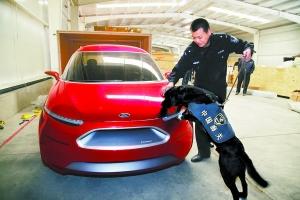 北京國際車展本月25日舉辦,目前空運(yùn)展品已經(jīng)大部分入境。為防止展品中夾藏違禁品,海關(guān)緝毒犬基地派出兩條訓(xùn)練有素的緝毒犬協(xié)助關(guān)員現(xiàn)場查驗(yàn)。張鵬 唐延智攝