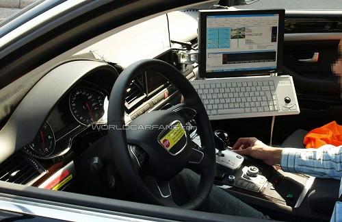 最近諜照記者設(shè)法拍到了奧迪新一代A8的內(nèi)裝照片。雖然這輛測試車的內(nèi)裝混合了現(xiàn)行版和下一代車型的內(nèi)裝配置,但仍能看出新車采用了新的方向盤,經(jīng)過升級的儀表群以及造型古怪的變速桿,它或許可以提供包括自動泊車等先進(jìn)功能。測試人員右側(cè)放置的電腦顯示了新車正在測試的是車輛監(jiān)測技術(shù),該技術(shù)利用攝像頭和傳感器來探測車輛是否處于可能與其他車輛發(fā)生碰撞的危險環(huán)境中。