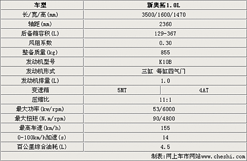 今年下半年將在長安鈴木投產(chǎn)的新奧拓,長寬高分別達(dá)到3500/1600/1470毫米,軸距也達(dá)到了2360毫米,與長安奔奔等車型同一級別。作為一款微型轎車,新奧拓的風(fēng)阻系數(shù)達(dá)到了0.3,再加上855kg的整備質(zhì)量,對整車的動力性能有很大幫助。