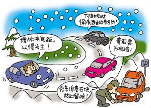 對于雪地的駕駛技巧,交警部門提醒車主,關鍵是以“慢”為主,并與前車保持足夠的剎車距離。然而,路況的復雜,讓很多駕駛員在發(fā)生側滑時感到緊張!叭绻囕v打滑,方向盤要順著打滑方向輕輕地轉,待車輪回正后,再輕輕地踩剎車。”“關鍵是要慢,平穩(wěn)地減速及輕踩剎車,絕對不要在冰雪濕滑的路面上猛起步,或緊急剎車!焙汲琴Y深出租車司機師傅們紛紛提供雨雪天氣駕駛竅門。