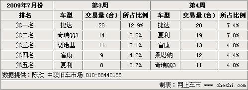 今日,筆者從北京中聯(lián)汽車交易市場了解到,隨著二手車市場淡季持續(xù)深入,二手車收購和銷售放緩趨勢明顯,并呈現(xiàn)出兩級分化趨勢,中低端車銷量趨于良好,高端車滯銷明顯。上周的二手車交易量比6月份有所減少。根據(jù)7月份最后兩周的銷量排名來看,實用、經(jīng)濟型轎車還是受到消費者的追捧。詳見下表: