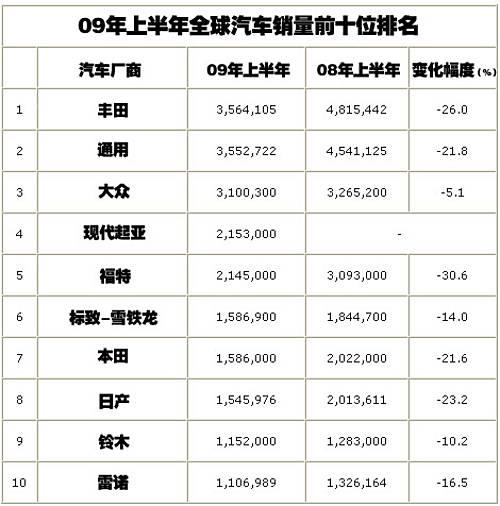 2009年已經(jīng)過半,各大汽車廠商也將會對自己上半年的汽車銷售銷量做一下統(tǒng)計。受全球經(jīng)濟危機的影響,各汽車廠商的銷售也分別受到了不同程度的影響。而以下則是來自汽車新聞數(shù)據(jù)中心的數(shù)據(jù), 下面就讓我們來看看排在前十位的汽車品牌在上半年的銷售情況如何。