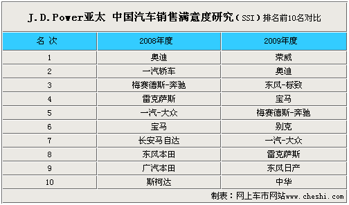 通過以上08年度與09年度的J.D. Power(亞太公司)中國汽車銷售滿意度前10名的對比我們不難看出,合資品牌還是占據(jù)了主要的位置,但日系廠商的排名有所下降。08年度的第一名奧迪意外的被自主品牌榮威所代替,寶馬提升至第4名,梅賽德斯-奔馳落后2名。而中華則闖入前10名,替代了斯柯達的位置。