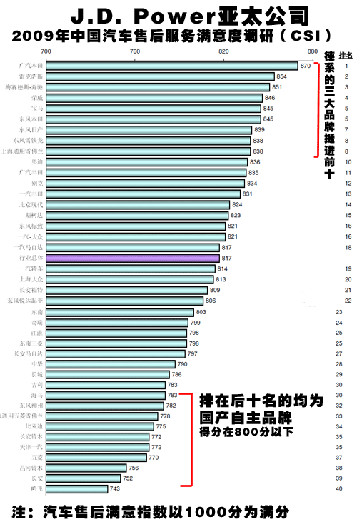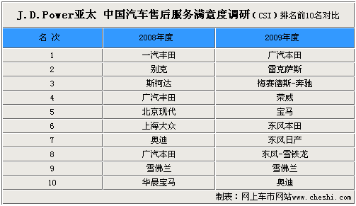 在了解完銷售方面的情況后,我們在來看下消費者最關(guān)注的售后服務(wù)的情況。通過以上08年度與09年度的J.D. Power(亞太公司)中國汽車售后服務(wù)滿意度調(diào)研(CSI)前10名的對比我們可以發(fā)現(xiàn),德系的三大品牌均榜上有名,自主品牌榮威首次上榜就位列第4,而日系品牌新增雷克薩斯與東風日產(chǎn)。而08年度排名第7的奧迪排名跌至第10名。