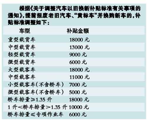 本次補貼標準大幅度提高,比此前補貼標準提高2000元~1.2萬元不等,最高補貼標準為1.8萬元。其中,報廢1.35升及以上排量轎車,補貼1.8萬元;報廢1升(不含)~1.35升(不含)排量轎車,補貼1萬元;報廢1升及以下排量轎車、專項作業(yè)車,補貼標準仍為每輛補貼6000元。報廢載貨和載客汽車,補貼標準5000元~1.8元萬不等,對比去年4月份的補貼標準大幅度提高。