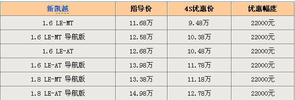 筆者日前走訪北京上海通用4S店時(shí)獲悉,目前新凱越優(yōu)惠再升2000元,達(dá)到了最高2.2萬(wàn)元的讓利,這也是去年以來最高的優(yōu)惠記錄。由于現(xiàn)在新凱越庫(kù)存車較多,顏色齊全,對(duì)這款車感興趣的消費(fèi)者近期可以出手了。