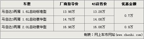 據(jù)經(jīng)銷商處銷售人員介紹,目前馬自達(dá)3兩廂有1.6L和2.0L兩種排量共三款車型在售。馬自達(dá)3兩廂2.0L車型優(yōu)惠為9000元,1.6L車型優(yōu)惠為7000元。經(jīng)7000元的優(yōu)惠后,1.6L自動標(biāo)準(zhǔn)型和1.6L自動豪華型售價仍為13.28萬元和14.08萬元,全系最高配的2.0L自動豪華型經(jīng)9000元的優(yōu)惠后,售價為16.08萬元。