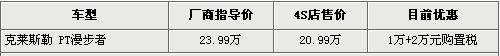 筆者從克萊斯勒北京地區(qū)經(jīng)銷商處了解到,目前PT漫步者這款車只有一款車型在售,售價(jià)為23.99萬元,現(xiàn)階段購(gòu)車的話可以贈(zèng)送2萬元購(gòu)置稅,同時(shí)4S店內(nèi)可以有1萬元的現(xiàn)金優(yōu)惠,優(yōu)惠后售價(jià)近21萬元。在顏色方面,這款車有黑色、銀色、紅色、藍(lán)色、灰色等多款可供消費(fèi)者選擇,目前4S店內(nèi)顏色不太齊全,個(gè)別款還需要消費(fèi)者預(yù)定。
