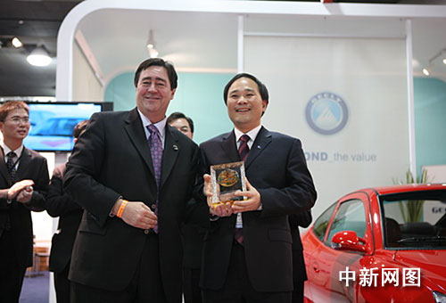 中新網(wǎng)1月16日電 當(dāng)?shù)貢r(shí)間1月14日下午,2008底特律車展組委會(huì)主席卡爾•加里亞拉來到吉利展臺(tái),將本次展會(huì)一份非常特殊的大獎(jiǎng)授予吉利集團(tuán)董事長李書福,表彰他多年來領(lǐng)導(dǎo)吉利汽車不斷進(jìn)取、不斷進(jìn)步所取得的非凡成就。
