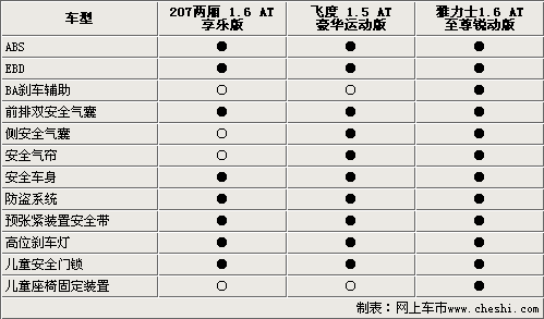 我們選取的三款車型均是各自車款中的高配車型,所以各自的安全配置都比較全面。ABS 、EBD、前排安全氣囊均為這三款車型的標準配置。同時安全車身、預緊安全帶、高位剎車燈也保證了它們的行駛安全,但是仔細看下來,標致207的裝備似乎比較單薄,沒有配備策安全氣囊和安全氣簾。豐田雅力士裝配了BA剎車輔助系統(tǒng),該系統(tǒng)利用傳感器感應駕駛者對制動踏板踩踏的力度與速度大小,從而使制動力快速產生,減少制動距離。在兒童保護方面,三款車型均配有兒童安全門鎖,雅力士還配備了后排兒童座椅固定裝置。
