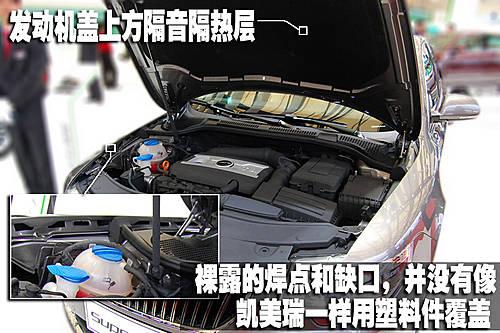 斯柯達(dá)昊銳的發(fā)動(dòng)機(jī)艙布局也是比較整齊,位于發(fā)動(dòng)機(jī)蓋上方的隔音隔熱層非常厚實(shí)面積也很大。但是記者注意到在前翼子板內(nèi)側(cè)制造中留下的工藝孔并沒(méi)有像凱美瑞一樣用塑料件覆蓋。