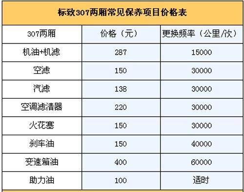 5.保養(yǎng)費(fèi): 我們向標(biāo)致4S店售后服務(wù)人員咨詢過,他們說307一大優(yōu)勢是保養(yǎng)周期比較長,1.5萬公里才需要保養(yǎng)一次,是同級車型中保養(yǎng)花費(fèi)最低的。通常新車首保在7500公里時(shí)進(jìn)行,以后每1.5公里保養(yǎng)一次。第二次1.5萬公里時(shí)的常規(guī)保養(yǎng)(更換機(jī)油機(jī)濾)需花費(fèi)287元;3萬公里保養(yǎng)(更換機(jī)油機(jī)濾+空濾+空調(diào)濾芯+汽濾+火花塞)為795元;4.5萬公里保養(yǎng)(更換機(jī)油機(jī)濾)花費(fèi)287元;6萬公里保養(yǎng)(更換機(jī)油機(jī)濾+空濾+空調(diào)濾芯+汽濾+火花塞)為795元。