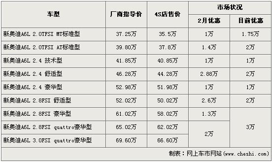 記者從奧迪地區(qū)經(jīng)銷商處了解,奧迪新A6L全系有不同程度優(yōu)惠調(diào)整,最高達(dá)到了3萬元。入門級(jí)的2.0TFSI手動(dòng)標(biāo)準(zhǔn)型優(yōu)惠金額上漲到了1.75萬元,2.0TFSI自動(dòng)標(biāo)準(zhǔn)型優(yōu)惠金額也上漲到了2萬元。2.4L排量除了舒適型優(yōu)惠金額減小到了2萬元外,同排量其他車型優(yōu)惠金額均沒變。全系高配的2.8FSI四驅(qū)型和3.0FSI四驅(qū)型的售價(jià)也從2萬元升到了3萬元,達(dá)到了全系最高。