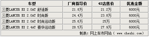 據(jù)經(jīng)銷商透露,由于剛剛經(jīng)歷了召回風波,所以基于市場以及銷量等多方面的考慮,才開始優(yōu)惠促銷。除最低配置的舒適版車型各家店內(nèi)均無車需要單獨預(yù)訂外,其他車型均有現(xiàn)車,且顏色齊全。全系LANCER EX車型均在原價基礎(chǔ)上優(yōu)惠6000元,消費者可隨意挑選。
