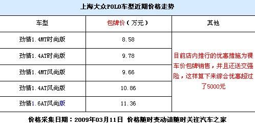 近期小型車市場可以說是大事不斷,峰范、嘉年華的先后上市都對(duì)這一市場的格局造成了一定的影響,而作為這一系列的主力車型之一的POLO車型也不甘示弱。近期,筆者通過深圳地區(qū)的上海大眾經(jīng)銷商處了解到,目前POLO 勁情車型在深圳地區(qū)的優(yōu)惠措施為裸車價(jià)包牌銷售,即相當(dāng)于免除了購置稅、上牌費(fèi)等一系列費(fèi)用,并且還送交強(qiáng)險(xiǎn)。具體詳情請見下表: