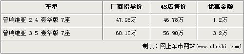 對(duì)中國(guó)的消費(fèi)者來(lái)說(shuō),豐田普瑞維亞是一款耳熟能詳?shù)能囆,通常人們都成為大霸王。這款車在空間、舒適度和配置等方面在同級(jí)別車型中擁有比較明顯的優(yōu)勢(shì),但價(jià)格卻一直居高不下。根據(jù)網(wǎng)上車市價(jià)格監(jiān)測(cè)系統(tǒng)顯示,目前普瑞維亞出現(xiàn)了最高3.2萬(wàn)元的優(yōu)惠,具體車型已經(jīng)價(jià)格如下:
