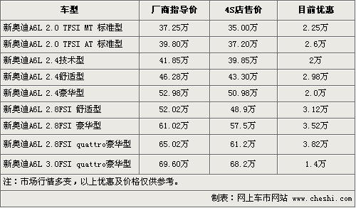 新款?yuàn)W迪A6L通過外觀和安全等方面的改款升級(jí),在同級(jí)別車型中擁有了更高的性價(jià)比,入門級(jí)車型價(jià)格更能夠比拼寶馬3系等對(duì)手。根據(jù)網(wǎng)上車市價(jià)格監(jiān)測(cè)系統(tǒng)顯示,目前奧迪A6L全系優(yōu)惠幅度有進(jìn)一步增加,2.0入門車優(yōu)惠后僅售35萬,具體車型以及價(jià)格如下: