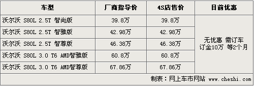 S80L加長版是沃爾沃專門為中國市場量身打造的一款全新豪華車,軸距加長140毫米,配置更加豪華,以滿足中國消費(fèi)者的需求。國產(chǎn)加長版包括了2.5T和3.0兩個(gè)排量共5款車型。目前北京地區(qū)加長版車型現(xiàn)車緊缺,均需要提前預(yù)訂,具體行情如下: