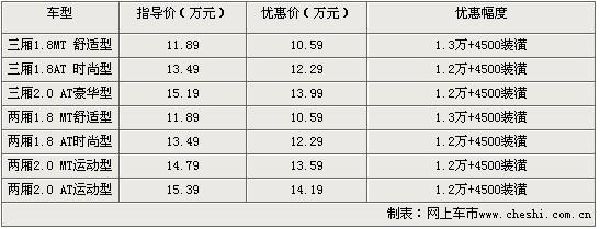 ?怂沟脑O(shè)計來自歐洲福特,歐洲式的簡潔是其帶給人們的第一印象,線條略顯平淡,明朗的腰線、寬厚的輪眉,使得?怂拐w感覺變得更為強壯,在視覺效果上就更顯車身穩(wěn)重,但還?怂顾鶄鬟_的運動風(fēng)格依舊很強烈。兩廂版看上去更加的運動,三廂版更家用化一些。,目前上海地區(qū)購買?怂共糠周囆涂梢缘玫1.3萬元的價格優(yōu)惠。具體車型售價見下表: