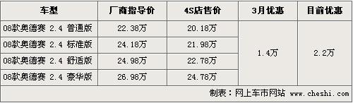 據(jù)北京地區(qū)廣州本田4S點(diǎn)銷售人員表示,目前銷售的08款?yuàn)W德賽降幅又出現(xiàn)了新的優(yōu)惠幅度。3月份左右,奧德賽全系優(yōu)惠到了1.4萬(wàn)元,而目前增加到了2.2萬(wàn)元,直接增加8000元,最低價(jià)格僅售20.18萬(wàn)元。現(xiàn)在購(gòu)車除了可以得到現(xiàn)金優(yōu)惠外,還可以得到商家贈(zèng)送的原廠汽車裝飾。在現(xiàn)售的四款?yuàn)W德賽車型中,普通版座椅為絨布材質(zhì),其他三款均為真皮材質(zhì),現(xiàn)車多以黑色和銀色為主。