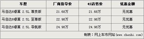 2009年4月12日,在大家的眾所期盼中代表了全球B級車最新進化方向,經(jīng)過全新元素設(shè)計的馬自達(dá)6睿翼正式上市。睿翼率先投放的車型排量為2.5L,車型分為尊貴版、至尊版和導(dǎo)航版三款,售價區(qū)間為21.68萬元-24.98萬元,F(xiàn)在各家一汽馬自達(dá)經(jīng)銷店已經(jīng)接受睿翼的預(yù)訂,具體車型價格請看下表:
