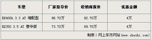 根據(jù)網(wǎng)上車市價(jià)格監(jiān)測(cè)系統(tǒng)顯示,目前在80萬(wàn)級(jí)別的進(jìn)口SUV中,寶馬X5,奧同Q7的優(yōu)惠都 在4萬(wàn)元的幅度,可見(jiàn)4萬(wàn)元的優(yōu)惠是一個(gè)比較常見(jiàn)的讓利。而雷克薩斯RX350自上市以來(lái)的優(yōu)惠最高大約去到6萬(wàn)元左右,在新款上市后,舊款RX350的剩車已經(jīng)不多。