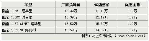 酷寶系列車型,不僅外形時尚,動力也相當充沛,不僅可與進口跑車如蓮花競速相媲美,也帶動了自主跑車市場的競爭。近期網(wǎng)上車市網(wǎng)站了解到,隨著市場競爭的加劇,現(xiàn)在各家4S店均可給出全系12000元的現(xiàn)金優(yōu)惠,令此車型再次引起關注。具體詳情如下: