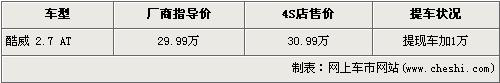 據(jù)4S店銷售人員介紹,在售的道奇酷威為2.7L自動檔車型,售價為29.9萬元。近期購買酷威的消費(fèi)者如要在經(jīng)銷店提現(xiàn)車,需在廠商指導(dǎo)價29.9萬元的基礎(chǔ)上加價1萬元才可提車。銷售人員還介紹,近期購買酷威的車主還可以享受到3年或8萬公里的超長質(zhì)保政策。