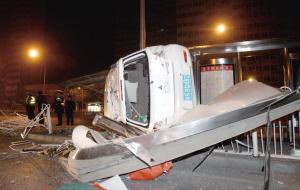 昨天(12月16日)凌晨1點,西二環(huán)主路官園橋北側,一輛白色三菱車行駛中突然失控,撞毀路側公交站亭后側翻。肇事司機系酒后駕駛。