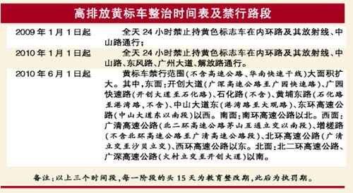 按照整治時(shí)間表,廣州市估計(jì)將有26萬(wàn)輛黃標(biāo)——高排放或高污染汽車,從2009年1月1日起,全天24小時(shí)禁止在內(nèi)環(huán)路及其放射線、中山路通行。