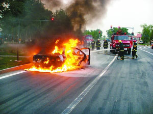 油箱存爆炸危險(xiǎn) 消防隊(duì)員冒險(xiǎn)撲救自燃尼桑轎車