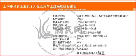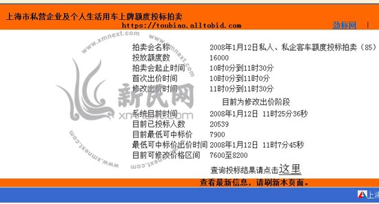 根據(jù)競(jìng)標(biāo)網(wǎng)友田小姐提供的數(shù)據(jù)顯示,10時(shí)開(kāi)始,投標(biāo)的網(wǎng)絡(luò)已人滿為患,投標(biāo)電話爆滿, 10:15分參與競(jìng)標(biāo)人數(shù)僅有3523人。10:19分參與競(jìng)標(biāo)人數(shù)3745人;11時(shí)修改價(jià)格開(kāi)始,投標(biāo)人數(shù)已增長(zhǎng)到25000余人, 11:25:36,最低可中標(biāo)價(jià)為7900元,11:29:38,可最低中標(biāo)價(jià)為8100元。