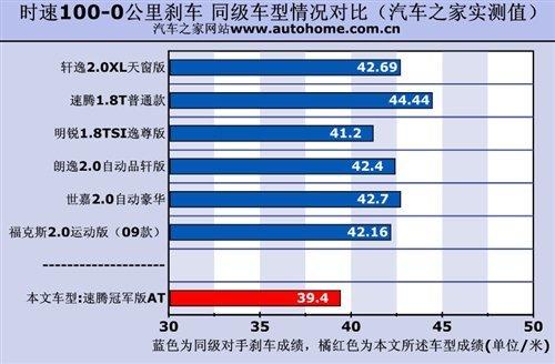 剛才我們說過,如果沒有新的寬胎加盟,速騰冠軍版將沒有資格被列入本文推薦車型,因為之前我們測過的1.8T速騰的剎車成績遠達44.48米,這雖然在合格范圍內(nèi),但對于一款強調(diào)性能的車型來說很難讓人滿意。而現(xiàn)在的速騰冠軍版在剎車系統(tǒng)不變的情況下,剎車距離大幅減小到39.4米,這個成績已經(jīng)和奔馳S500相差無幾了。不過冠軍版懸掛和普通版本并沒有區(qū)別,所以在全力剎車是點頭現(xiàn)象還是無可避免的。