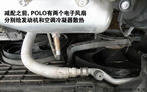 減配之前的POLO車(chē)前有一大一小兩個(gè)風(fēng)扇,一個(gè)是專門(mén)給發(fā)動(dòng)機(jī)水箱降溫的大風(fēng)扇,一個(gè)是專門(mén)給空調(diào)冷凝器降溫的小風(fēng)扇。減配之后,只剩下一個(gè)大風(fēng)扇,能夠同時(shí)給兩處提供散熱。