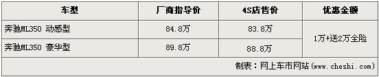 記者目前北京地區(qū)奔馳經銷店了解到,現在購買奔馳ML350動感版和豪華型的消費者都可享受現金1萬元的優(yōu)惠,并且購車的消費者還可獲得4S店贈送的全車的保險,價值2萬元左右。銷售人員還介紹,目前4S店內沒有奔馳ML現車供應,欲購買車需等待一個月左右方可提車。