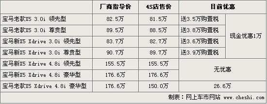 筆者從寶馬北京地區(qū)經銷商處了解到,近日寶馬重磅推出了“四重購車禮的”新春購車促銷活動,其中有一項是送車輛購置稅,針對車型包括X5在內。據介紹,從2月1日到3月31日期間購買X5的客戶可以贈送50%的車輛購置稅,其中包括了新老款共四款車型,但只針對3.0排量。新X5尊貴型3.0排量最高送近4萬元的購置稅,購車同時3.0排量還將有1萬元左右的現金優(yōu)惠。而目前老款X5豪華型1.8排量還有少量現車,當前最高優(yōu)惠可達到26.6萬元。4S店內有黑色和銀色的現車供應,消費者可到店咨詢具體行情。