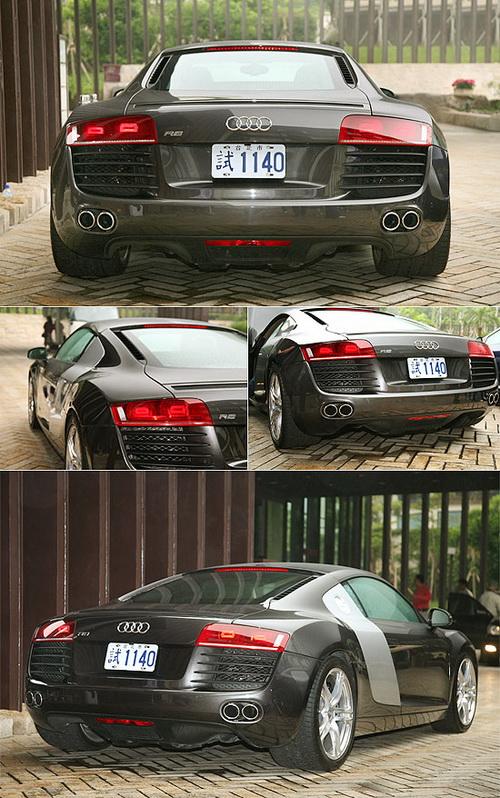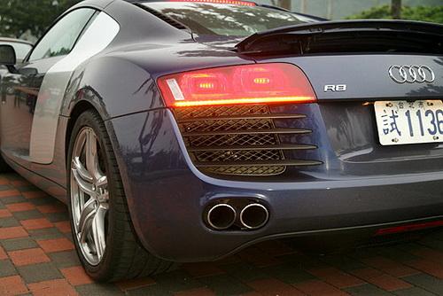 在車尾下部,R8采用左右對稱的四出排氣管設(shè)計,并很好的融合于車體之中。而車底也備有底盤擴(kuò)散板的設(shè)計,搭配擾流尾翼,達(dá)到空氣力學(xué)優(yōu)化的要求。