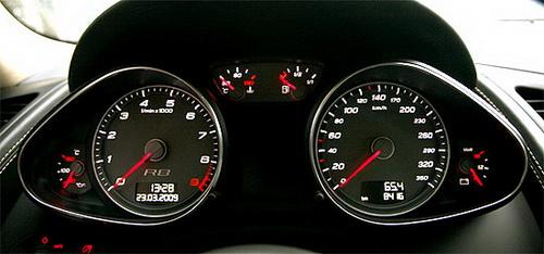 儀表板內(nèi),轉(zhuǎn)速表與時速表表底分別為9,000rpm與 350km/h,顯現(xiàn)R8傲人的性能實力;除了基本的油量表與水溫表外,電壓表和機(jī)油溫度表等輔助儀表,也是常見性能車型的儀表組合。