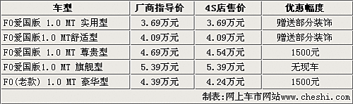 據(jù)比亞迪汽車(chē)4S店銷(xiāo)售人員介紹,現(xiàn)在比亞迪F0愛(ài)國(guó)版igo系列車(chē)型的現(xiàn)車(chē)比較齊全,只有旗艦型沒(méi)有現(xiàn)車(chē),但消費(fèi)者可以預(yù)訂。售價(jià)3.99萬(wàn)元的老款舒適型現(xiàn)在已經(jīng)停產(chǎn),而老款豪華型目前還有部分現(xiàn)車(chē)銷(xiāo)售。另外,比亞迪FO老款豪華型和尊貴型目前都可以優(yōu)惠現(xiàn)金1500元,實(shí)用型和新舒適型只可以贈(zèng)送部分裝飾。