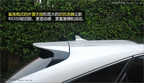 新RX350時(shí)髦地采用了多見于德系車的鯊魚戟式的天線,寬大的后擾流器作為標(biāo)配飾件出現(xiàn)在新車型上,讓整車在外觀上顯得動(dòng)感十足。