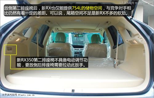 即使放倒了第二排座椅,新RX也只能提供754L的儲(chǔ)物空間,與一種德、美系車型動(dòng)輒超過1500L的后排儲(chǔ)物空間相比,仍然有著一定的差距?梢哉f,偏小的儲(chǔ)物空間是新RX350上不多的軟肋。