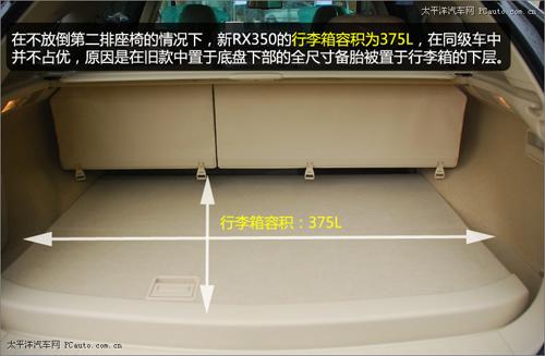 在不放倒第二排座椅的情況下,新RX350的行李箱容積為375L,在同級(jí)車中并不占優(yōu),原因是在舊款中置于地盤下部的全尺寸備胎被置于行李箱的下層。這樣設(shè)計(jì)的優(yōu)點(diǎn)就是讓司乘人員可以在車輛需要更換輪胎的時(shí)候,不至于要趴在徹底拆卸備胎。目前,越來越多的城市SUV采用這樣的設(shè)計(jì)。