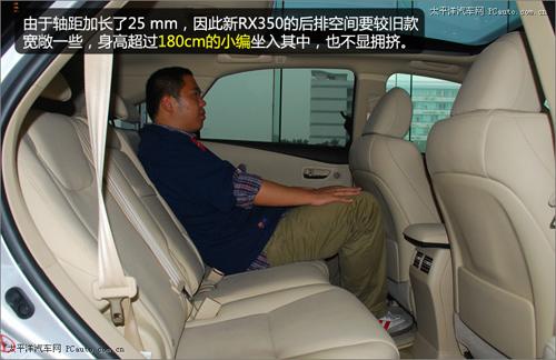 前文已經(jīng)提過,新RX350的車身長(zhǎng)度要較舊款長(zhǎng)30 mm,軸距也較舊款長(zhǎng)25mm,因此新RX350的后排空間要較舊款寬敞一些,身高超過180 cm的小編坐入其中,也不顯擁擠。不過由于車身高度較舊款車型有所降低,RX350后排的頭部空間與舊款相比沒有什么優(yōu)勢(shì)可言。
