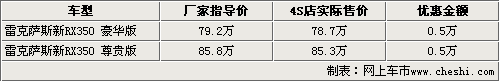 據(jù)北京雷克薩斯4S店銷售人員介紹,目前各4S店均有新RX350的現(xiàn)車銷售,而且貨源相對比較充足。現(xiàn)在購車在可以得到5000元的現(xiàn)金優(yōu)惠還,還可以得到商家贈送的簡單裝飾。銷售人員還表示,新款RX350由于原裝進(jìn)口車型,所以車型的手續(xù)還有到店。消費(fèi)者在購車后還需要等待10個(gè)工作日左右才可以上牌。